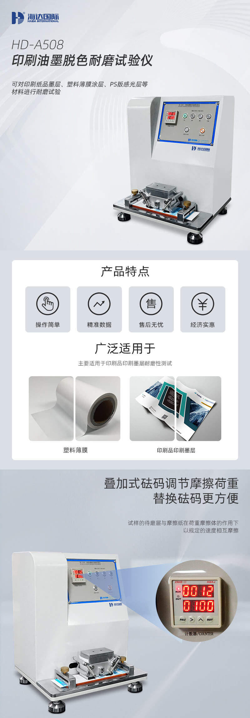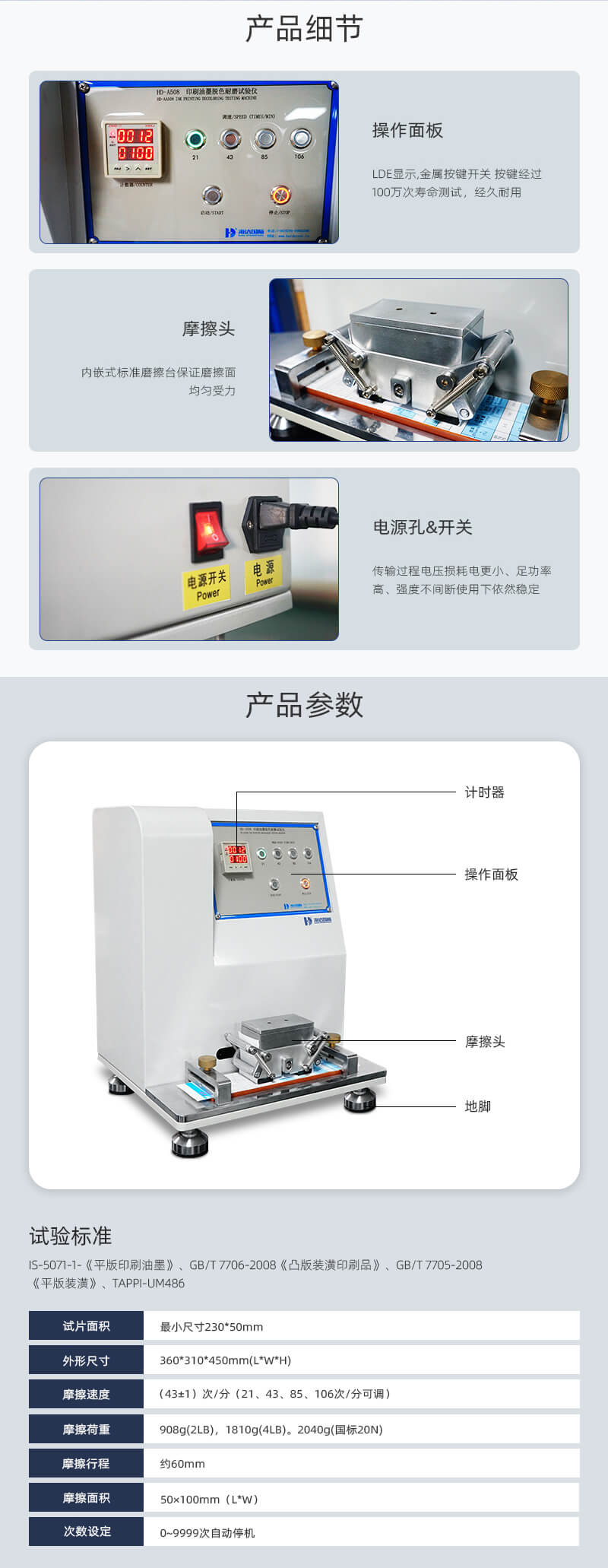 印刷油墨脫色耐磨試驗儀主要適用于印刷品印刷墨層耐磨性測試。將標準尺寸的摩擦紙包于摩擦頭,以規(guī)定的速度、壓力等對試樣表面進行摩擦,觀察試樣墨層脫落情況。
