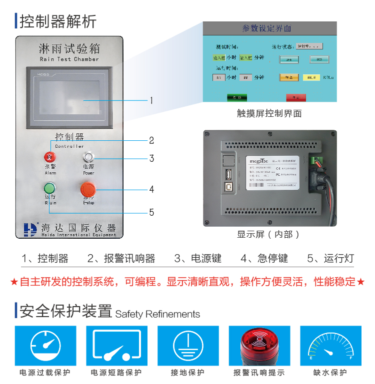 適用于測試產品在淋雨的氣候環境下的貯存、運輸和使用時的性能試驗,該設 備主要用于對電工電子產品、燈具、電柜、電器元件、汽車、摩托車及其零部件等產品 在模擬淋雨的氣候條件下,對產品的物理以及其它相關性能進行測試。