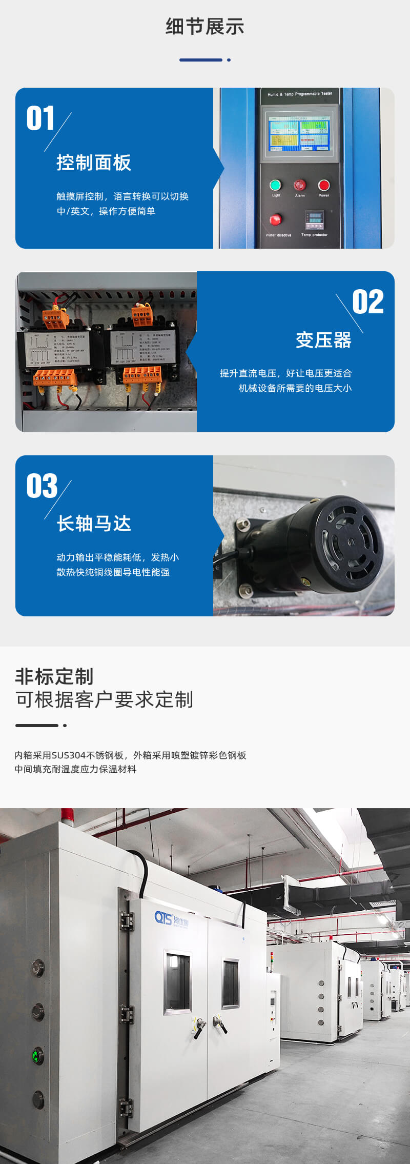 恒溫恒濕試驗房又名步入式恒溫恒濕試驗室,適用于整機或大型零部件的低溫、高溫、高低溫變化、恒定濕熱、高低溫交變濕熱試驗等??筛鶕?jù)用戶要求改變工作室尺寸與功能等;拼塊式箱體,造型美觀大方;科學(xué)的風(fēng)道設(shè)計,能滿足不同客戶的需求;采用觸摸屏,PLC程控器。