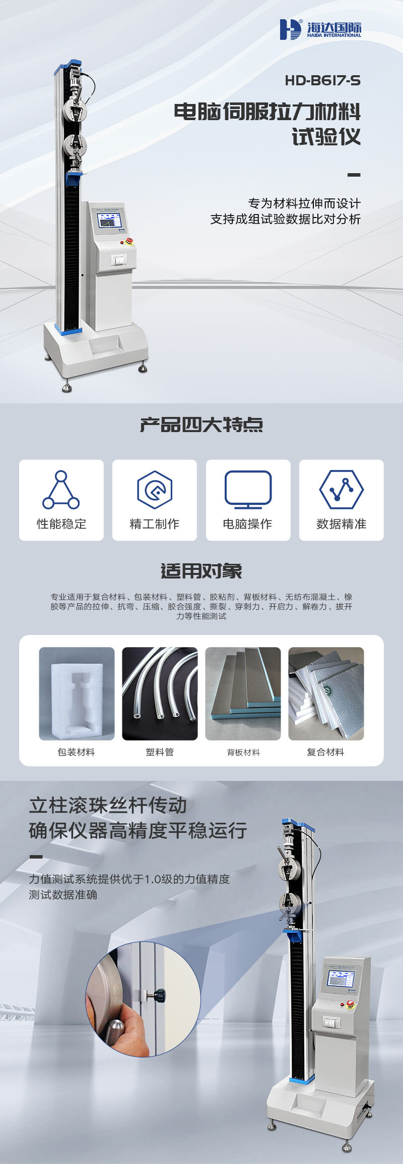電線電纜拉力機適用于復合材料、包裝材料、塑料管、膠粘劑、背板材料、無紡布、混凝土、橡膠等非金屬材料和醫療器械、線纜、鋼材等金屬產品的拉伸、抗彎、壓縮、膠合強度、撕裂、穿刺力、開啟力、解卷力、拔開力等性能測試。
