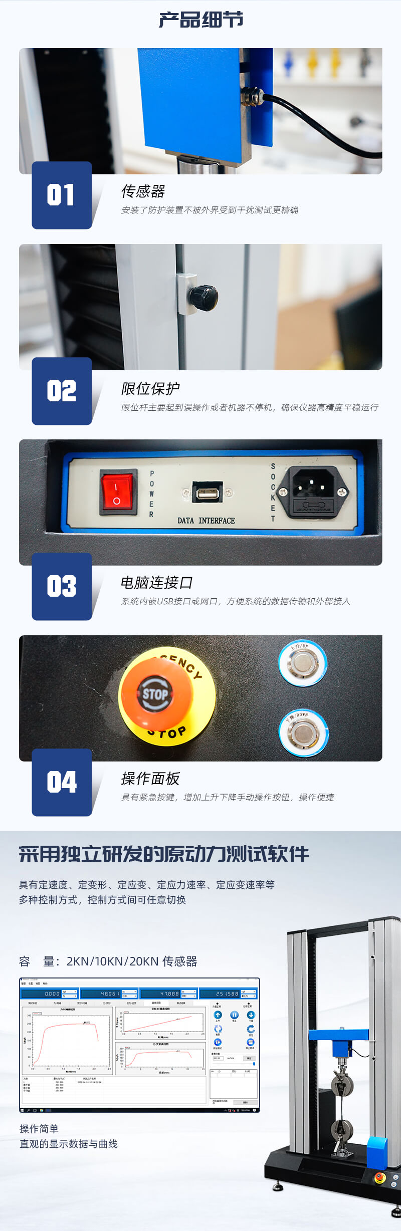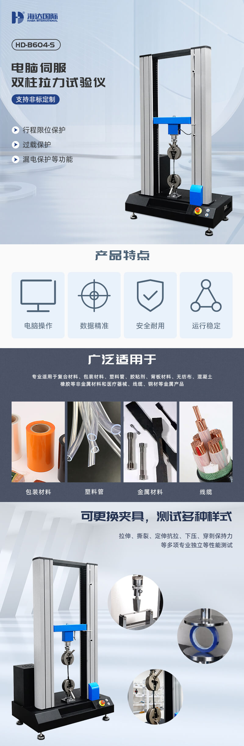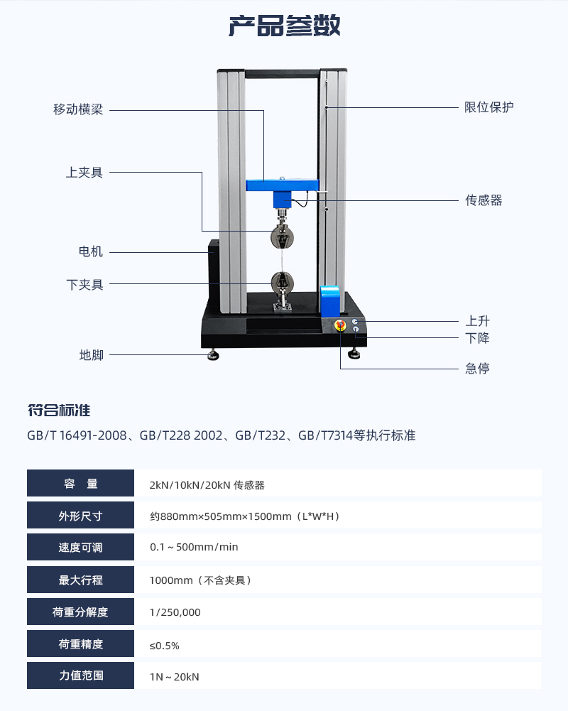 雙柱拉力試驗機專業適用于復合材料、包裝材料、塑料管、膠粘劑、背板材料、無紡布、混凝土、橡膠等非金屬材料和醫療器械、線纜、鋼材等金屬產品的拉伸、抗彎、壓縮、膠合強度、撕裂、穿刺力、開啟力、解卷力、拔開力等性能測試。