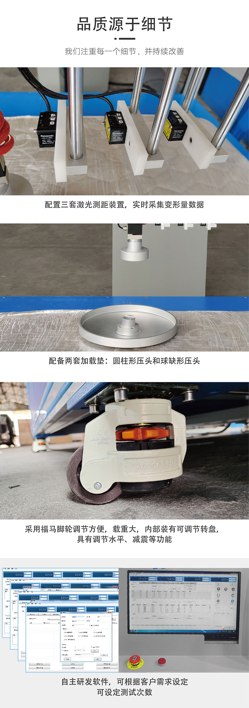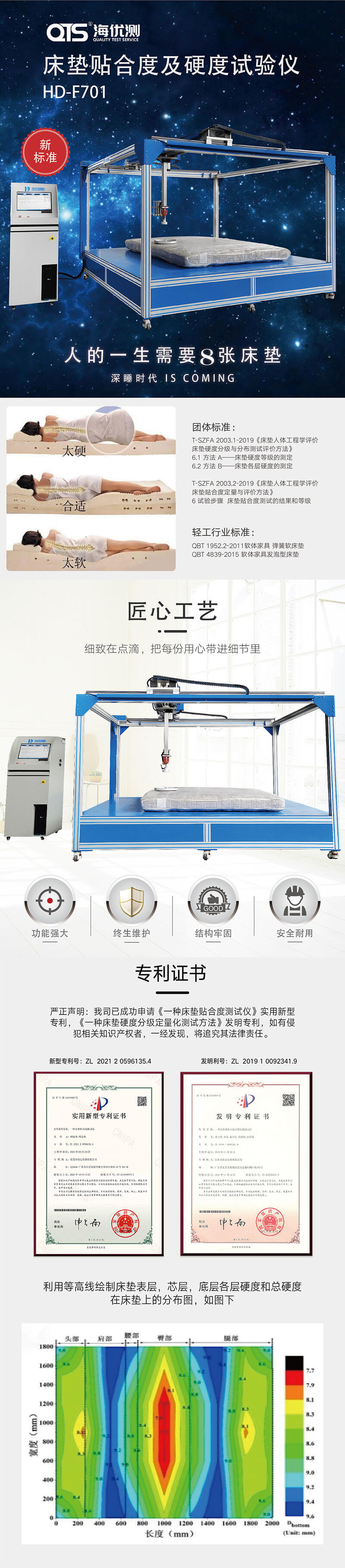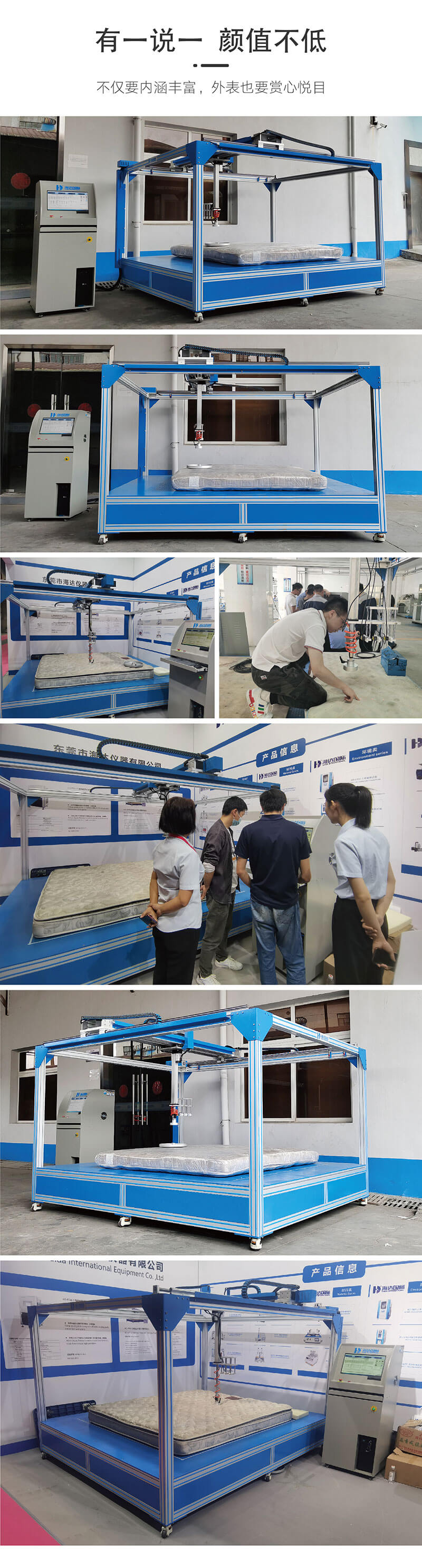 床墊貼合度綜合試驗機(jī)用于對家庭、酒店、旅館、飯店等場合使用的彈簧軟床墊和發(fā)泡型床墊進(jìn)行出廠成品檢測,對床墊硬度和滯后損失率及貼合度進(jìn)行測試,測試完成后根據(jù)測試評定試樣的等級。
